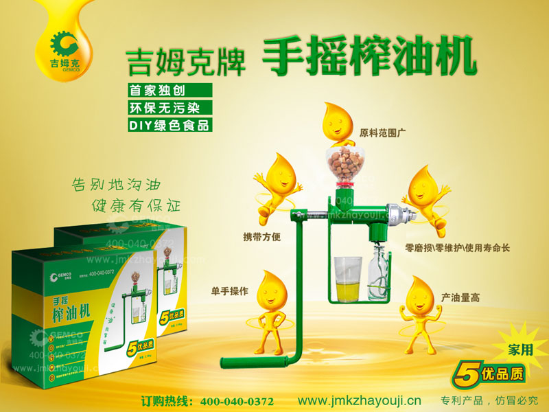 安阳吉姆克能源机械有限公司立足环保事业,能源事业;倡导健康环境,健康生活;吉姆克工程师基于中国古人的智慧,结合现代先进的制造工艺,历经若干年的产品开发,终于研制开发出适用于家庭使用的健康环保型微型手摇榨油机,该设备使用携带方便,轻巧坚固,适用于各种原料的压榨,最重要是,使用该设备,即使一个十几岁的小孩子也能单人完成所有的操作,让您和任何时候任何地点都能轻松为家庭榨出健康的油!